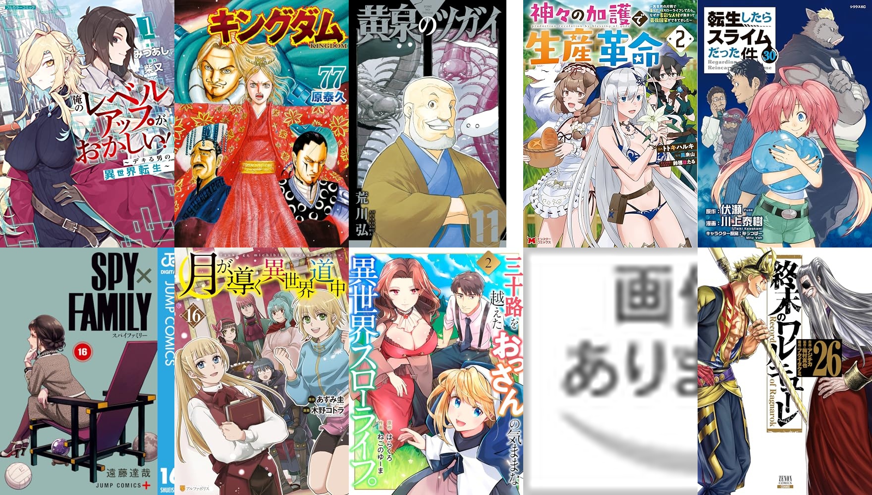 2025年11月08日版 Kindle新刊ランキングTOP10 kindle新刊ランキング 2025.11.08 2025年11月08日版 Kindle新刊ランキングTOP10 1位: 俺のレベルアップがおかしい! ~デキる男の異世界転生~ 1 (COMICらぐちゅう) 価格: ¥0 発売日: Amazonで詳細を見る 2位: キングダム 77 (ヤングジャンプコミックスDIGITAL) 価格: ¥732 発売日: Amazonで詳細を見る 3位: 黄泉のツガイ 11巻 (デジタル版ガンガンコミックス) 価格: ¥590 発売日: Amazonで詳細を見る 4位: 神々の加護で生産革命~異世界の片隅でまったりスローライフしてたら、なぜか多彩な人材が集まって最強国家ができてました~(コミック) : 2 (モンスターコミックス) 価格: ¥77 発売日: Amazonで詳細を見る 5位: 転生したらスライムだった件(30) (シリウスコミックス) 価格: ¥792 発売日: Amazonで詳細を見る 6位: SPY×FAMILY 16 (ジャンプコミックスDIGITAL) 価格: ¥585 発売日: Amazonで詳細を見る 7位: 月が導く異世界道中16 (アルファポリスCOMICS) 価格: ¥776 発売日: Amazonで詳細を見る 8位: 三十路を越えたおっさんの気ままな異世界スローライフ。2 (コミックアウル) 価格: ¥0 発売日: Amazonで詳細を見る 9位: 片田舎のおっさん、剣聖になる~ただの田舎の剣術師範だったのに、大成した弟子たちが俺を放ってくれない件~ 8 (ヤングチャンピオン・コミックス) 価格: ¥781 発売日: Amazonで詳細を見る 10位: 終末のワルキューレ 26巻 (ゼノンコミックス) 価格: ¥713 発売日: Amazonで詳細を見る